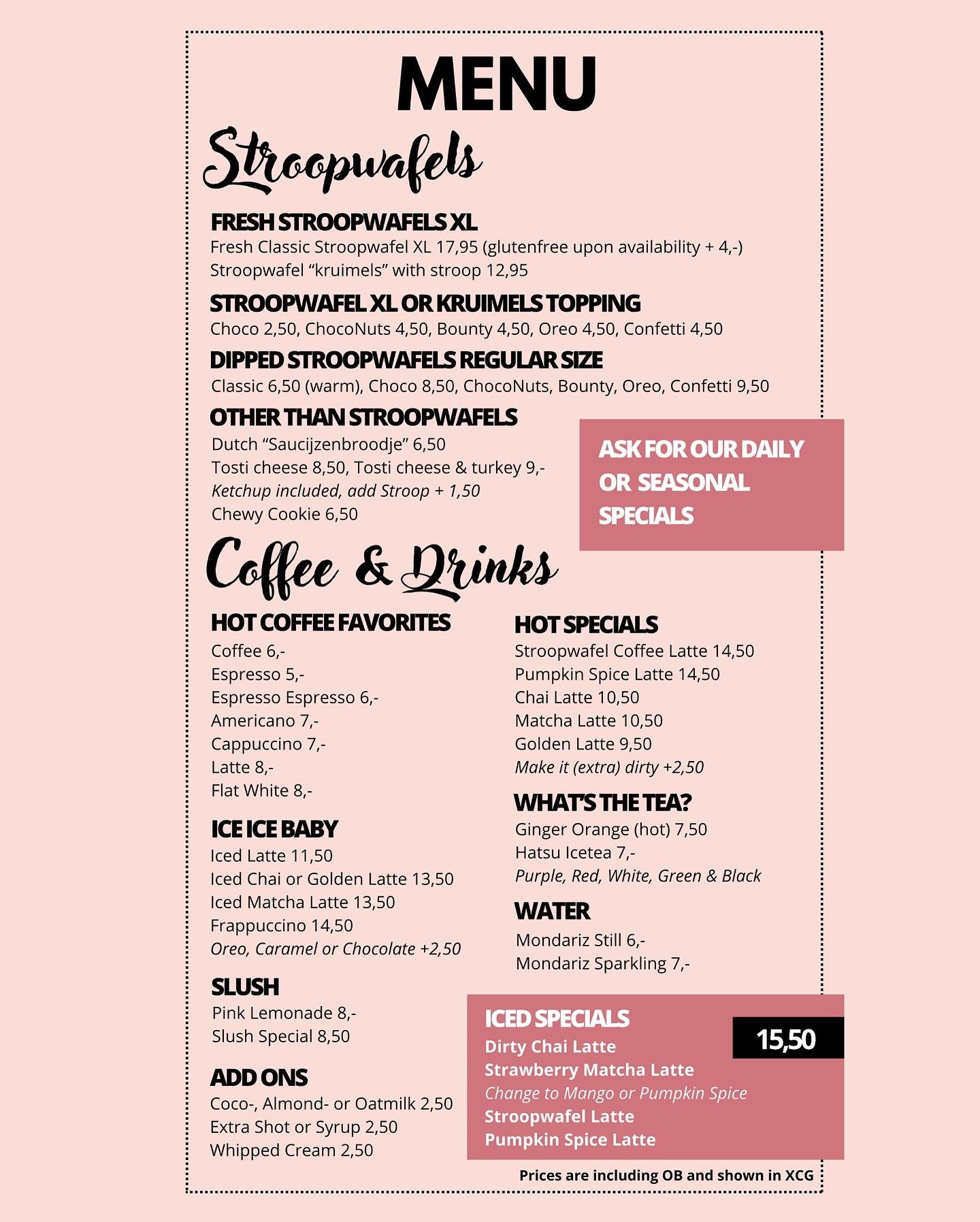 Our menu blends Dutch comfort with CuraƧao ease: warm stroopwafels straight from the iron, silky lattes, refreshing iced drinks, and small treats to satisfy every mood.